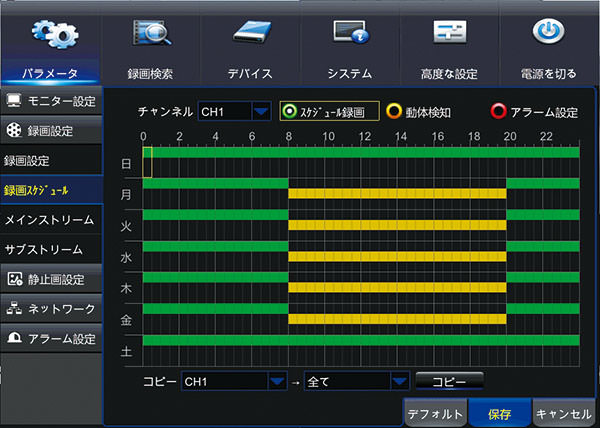 スケジュール録画・動体検知録画・アラーム設定を曜日ごと・30分単位で設定できます。