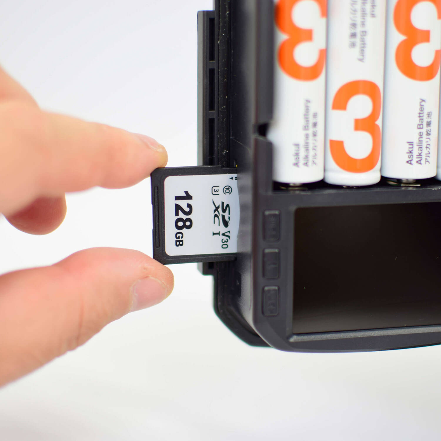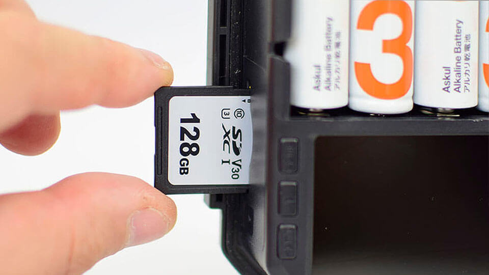 市販のSDカード(最大128GB)をセットして動画・静止画を記録できます。