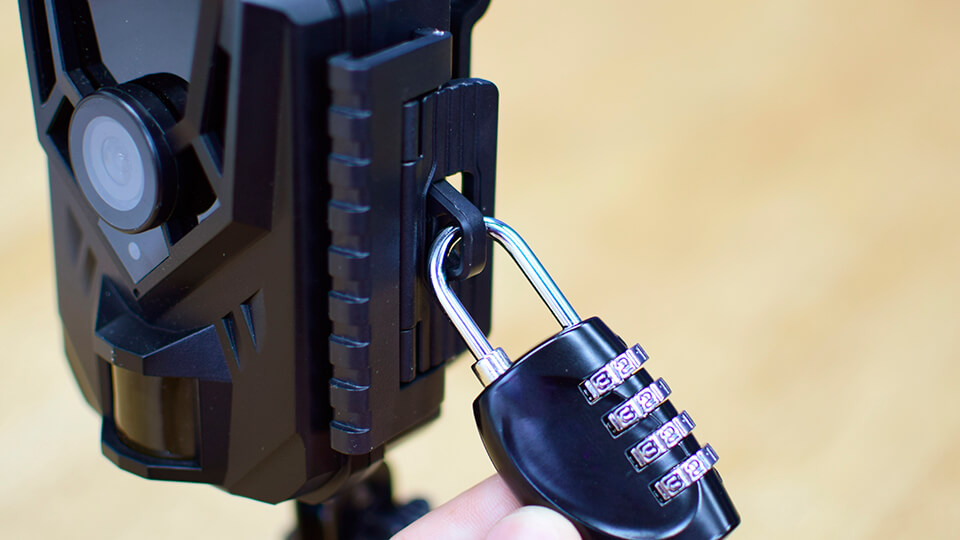 開閉部には市販の錠前が取り付けできます。いたずやらSDカードの盗難防止に役立ちます。※市販品をお求めください。
