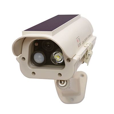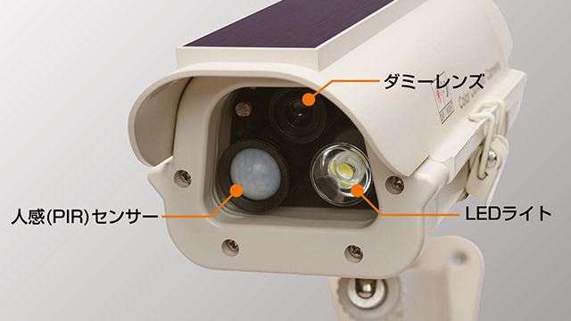 人感(PIR)センサーが人の動きなどを検知(検知距離は約5〜7m)すると正面のLEDがフラッシュ(点滅)して威嚇します。日没後は一回の検知で約30秒間LEDが点灯し続けます。光を放つことでカメラの設置場所を不審者へアピールして威嚇効果を高めます。