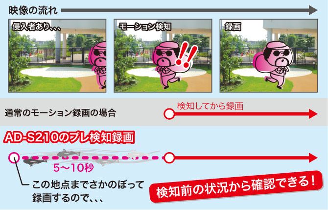AD-S210は"プレ検知録画"機能を搭載。モーション検知があった場合、自動的に5~10秒さかのぼった時刻からの映像が記録として残します。