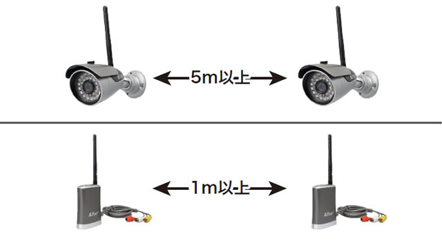 【カメラ同士5m 以上】【受信機同士1m 以上】の間隔をあけて設置してください。