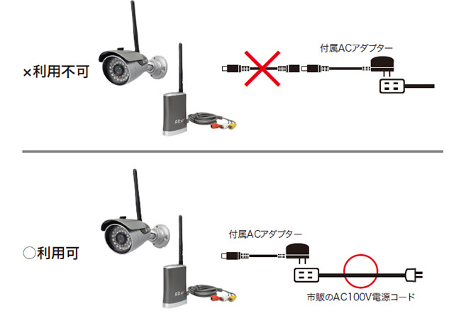 “コンセントが近くにない”または”形状が合わずうまく差し込み出来ない”などで設置できない場合は、市販の”屋外用の電源コード”等を利用してカメラの近くまでAC100Vコンセントを用意してください。
