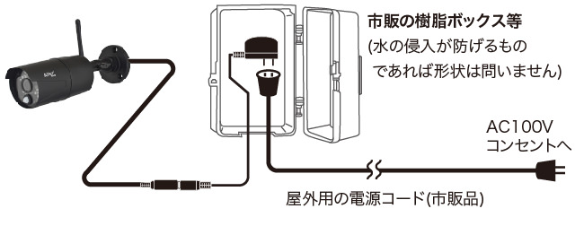 「コンセントが近くにない」または「形状が合わずうまく差し込み出来ない」などで設置できない場合は、市販の「屋外用電源コード」等を利用してカメラの近くまでAC100Vコンセントを用意してください。その際、コンセントとACアダプターの連結部分が屋外に露出してしまう場合は市販の樹脂ボックス等を用いて水の浸入が無いように保護してください。