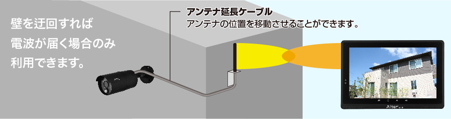 アンテナ延長ケーブルは、電波透過性の低い遮蔽物(コンクリート壁等)を回避してアンテナ間の見通しを確保します。無線カメラのアンテナ部に延長ケーブルを利用することで、アンテナを遮蔽物の少ない環境に移動させることができます。 ※写真はAL-HD05M