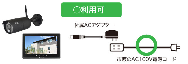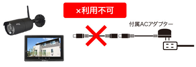 「コンセントが近くにない」または「形状が合わずうまく差し込み出来ない」などで設置できない場合は、市販の「屋外用電源コード」等を利用してカメラの近くまでAC100Vコンセントを用意してください。その際、コンセントとACアダプターの連結部分が屋外に露出してしまう場合は市販の樹脂ボックス等を用いて水の浸入が無いように保護してください。