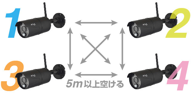 1台のモニターに最大で4台のカメラを受信登録可能です。1セット設置されている環境なら後からカメラだけを追加設置してシステムを拡張できます。※増設の際カメラ同士を近接させて利用することはできません。同一の場所でカメラが2台以上になる場合はカメラ同士が5m以上の間隔になるように設置してください。