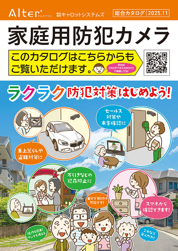 カタログダウンロード 家庭用防犯カメラカタログ (2025年11月号) A4 16ページ(PDFファイル) ダウンロード(18.2MB) あなたにもきっとできる!! 防犯カメラ取付講座 A4 両面三つ折り(PDFファイル) ダウンロード(2.1MB) 乾電池式カメラ AT-1/AT-2 カタログ A4 両面三つ折り(PDFファイル) ダウンロード(4.9MB)